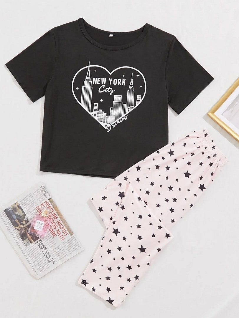 Black New York Printed Night Suit